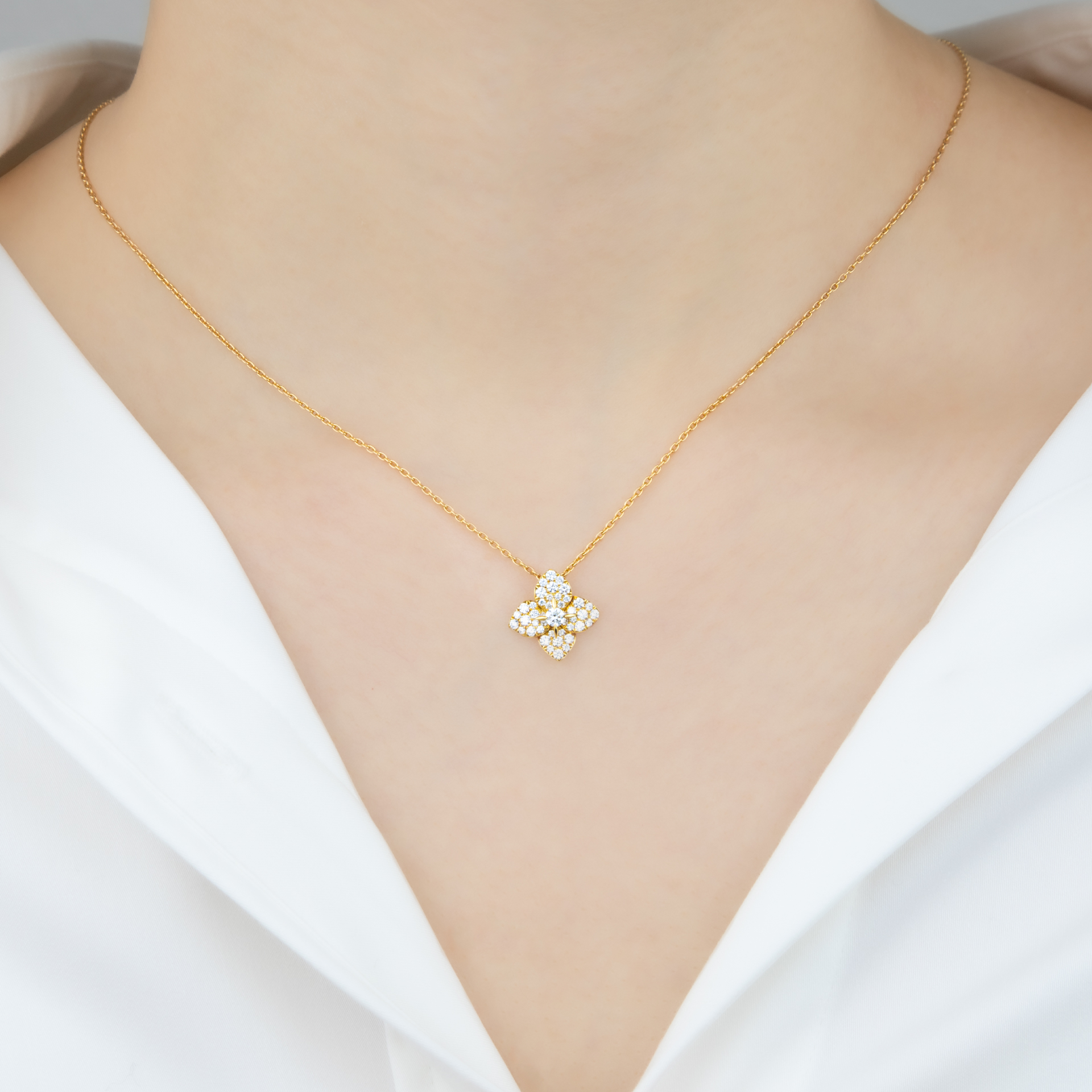 繊細な花弁に隙間なく敷き詰められているのは、OKURADOの厳格な基準を満たしたメレダイヤモンド。F/VS~の厳しい基準を設け、たとえハイグレードのダイヤモンドでも、光りの返りが悪ければ使用せず、4Cの基準では表せない独自の選別を行っています。