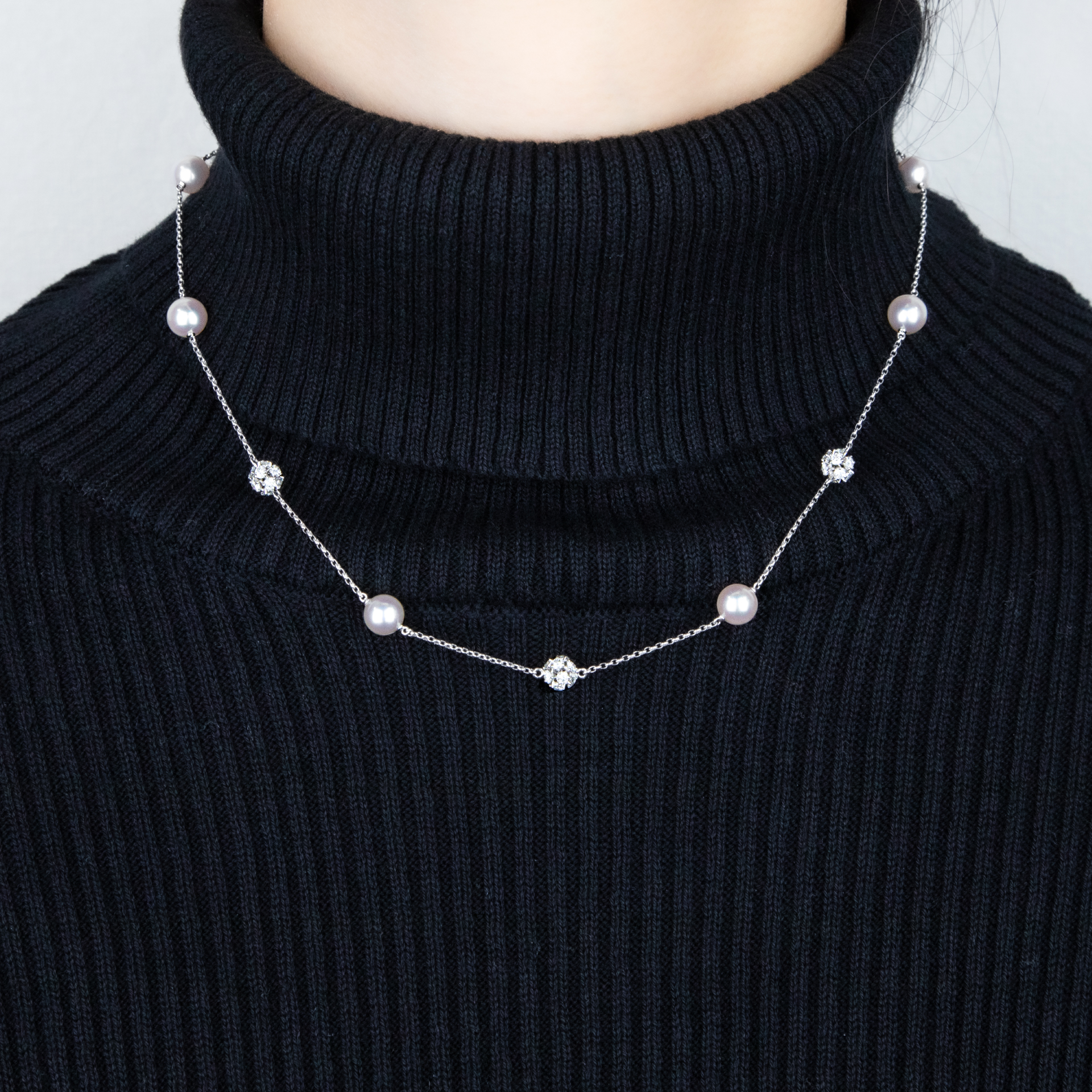 高品質のダイヤモンドとアコヤ真珠が織りなす、柔らかな印象のステーションネックレス。
