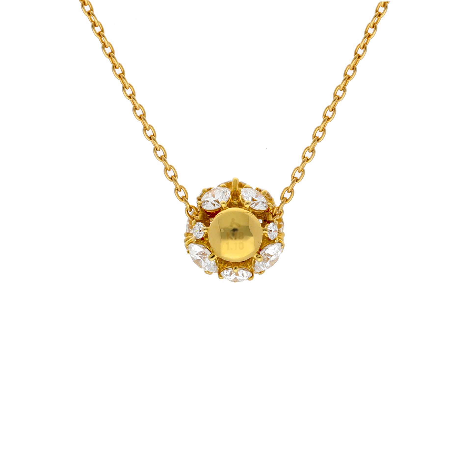 高品質のダイヤモンドが織りなす、可愛らしい丸いフォルムが特徴的なこのネックレスは、独自の製作方法で宝石の輝きを最大限に引き出しています。もともと丸いゴールドに宝石をセットするのではなく、セットした宝石達で徐々に球体に近づけゆく。よって中央部分はメタルが存在せず空洞になっています。遮るものが無くなった宝石は本来の輝きを永久的に放ち続けます。メレサイズのダイヤモンドにもF/VS~の厳しい基準を設けているOKURADO。
