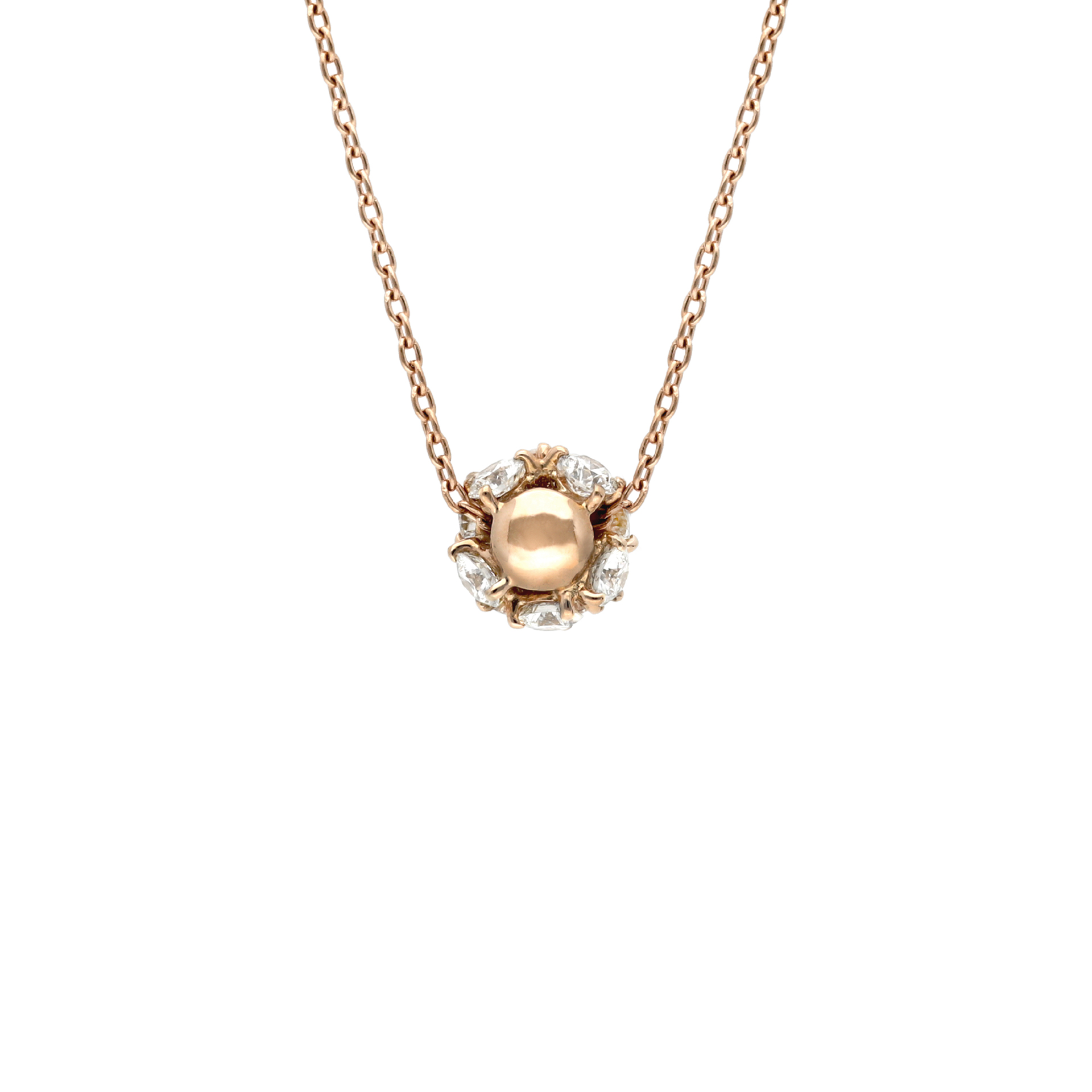 高品質のダイヤモンドが織りなす、可愛らしい丸いフォルムが特徴的なこのネックレスは、独自の製作方法で宝石の輝きを最大限に引き出しています。もともと丸いゴールドに宝石をセットするのではなく、セットした宝石達で徐々に球体に近づけゆく。よって中央部分はメタルが存在せず空洞になっています。遮るものが無くなった宝石は本来の輝きを永久的に放ち続けます。メレサイズのダイヤモンドにもF/VS~の厳しい基準を設けているOKURADO。