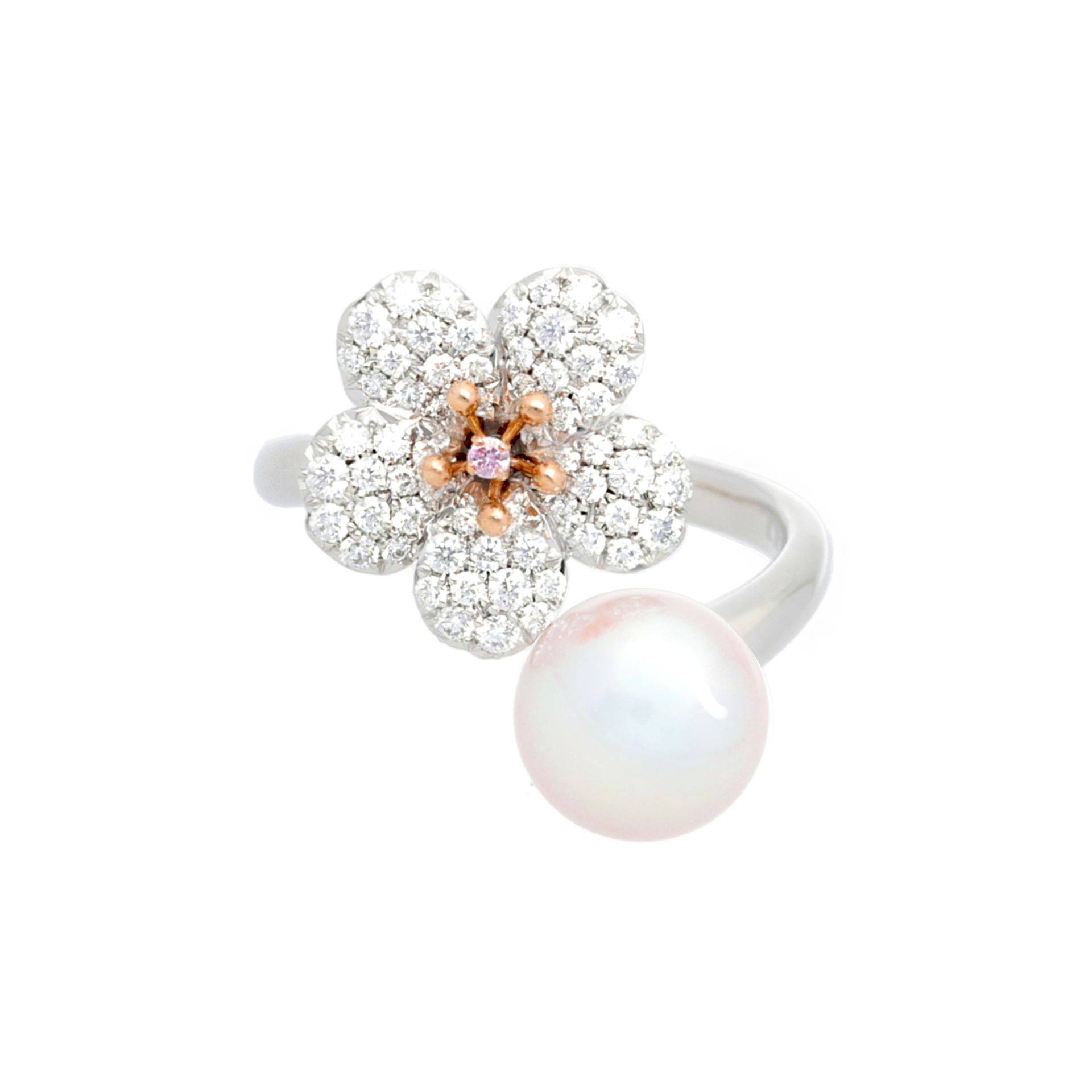 こちらは、テリの良いほんのり桜色のアコヤ真珠と組合せたリング。繊細な花びらに敷き詰められたのは、OKURADOの厳格な基準を満たしたメレダイヤモンド。桜の花芯には希少なピンクダイヤモンドを1石使用しています。 裏面は葉脈を模した裏取りを徹底しており、メタルを削ぎ落とすことでダイヤモンドは一層輝きを増し、軽量化とお手入れのし易さも実現しています。本物の桜と同じく、一枚一枚表情を変えた5枚の花弁は、曙光を受け真価を発揮。OKURADOの感性を一身に注ぎ込んだ桜花コレクション。