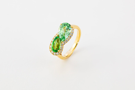 In contrast, garnet and tourmaline are a pale, subtle, delicate shade of green, rather than the deep green of emerald. The ring below features two well-polished, highly brilliant garnet and tourmaline stones as center stones. The diamonds around them are also understated in the design to express the subtle and beautiful green gradation of nature’s fresh greens.