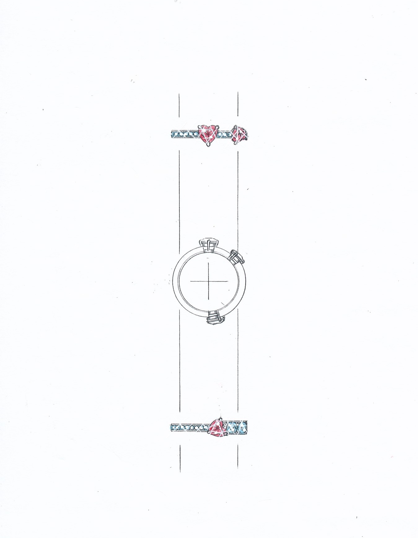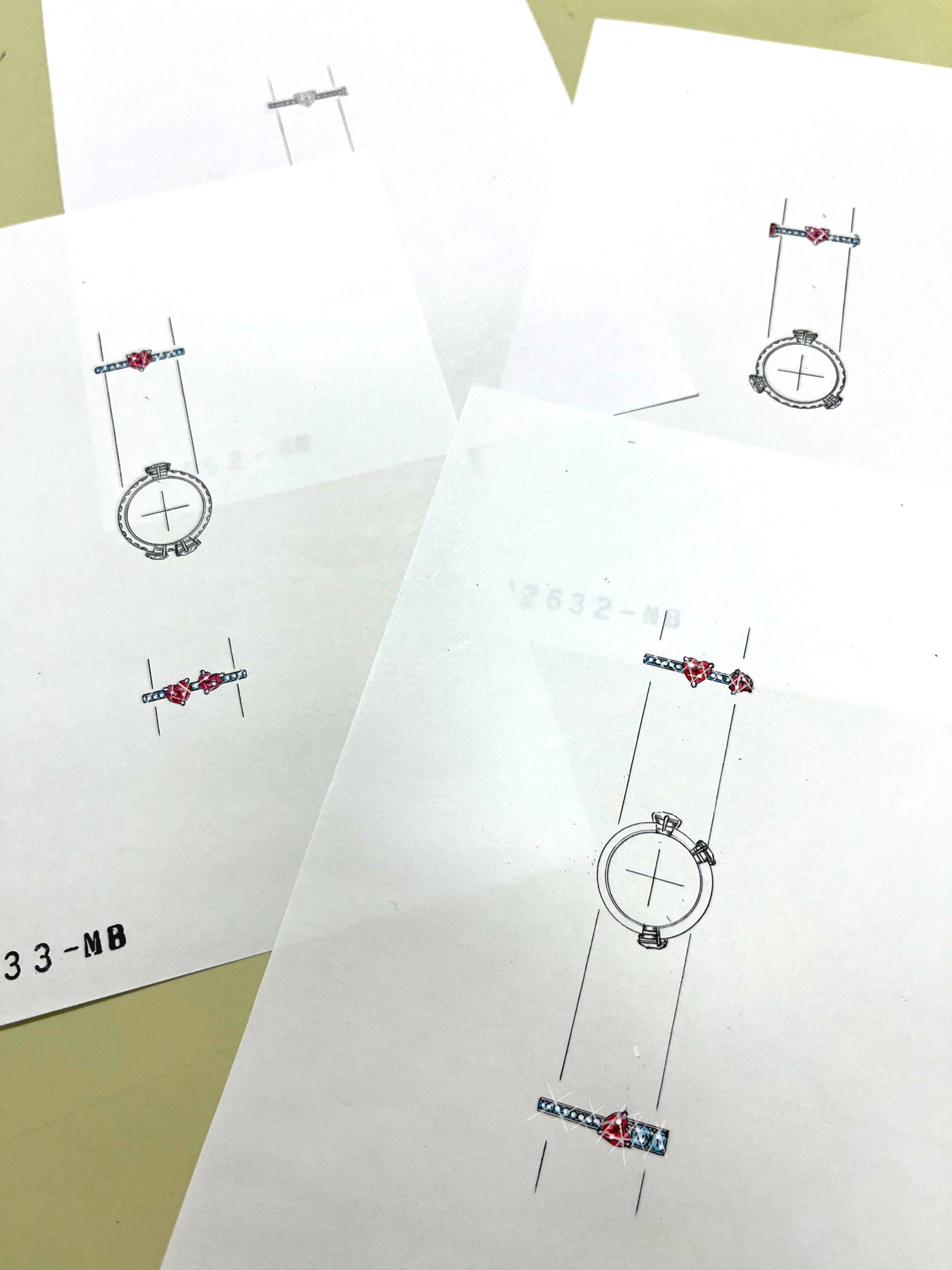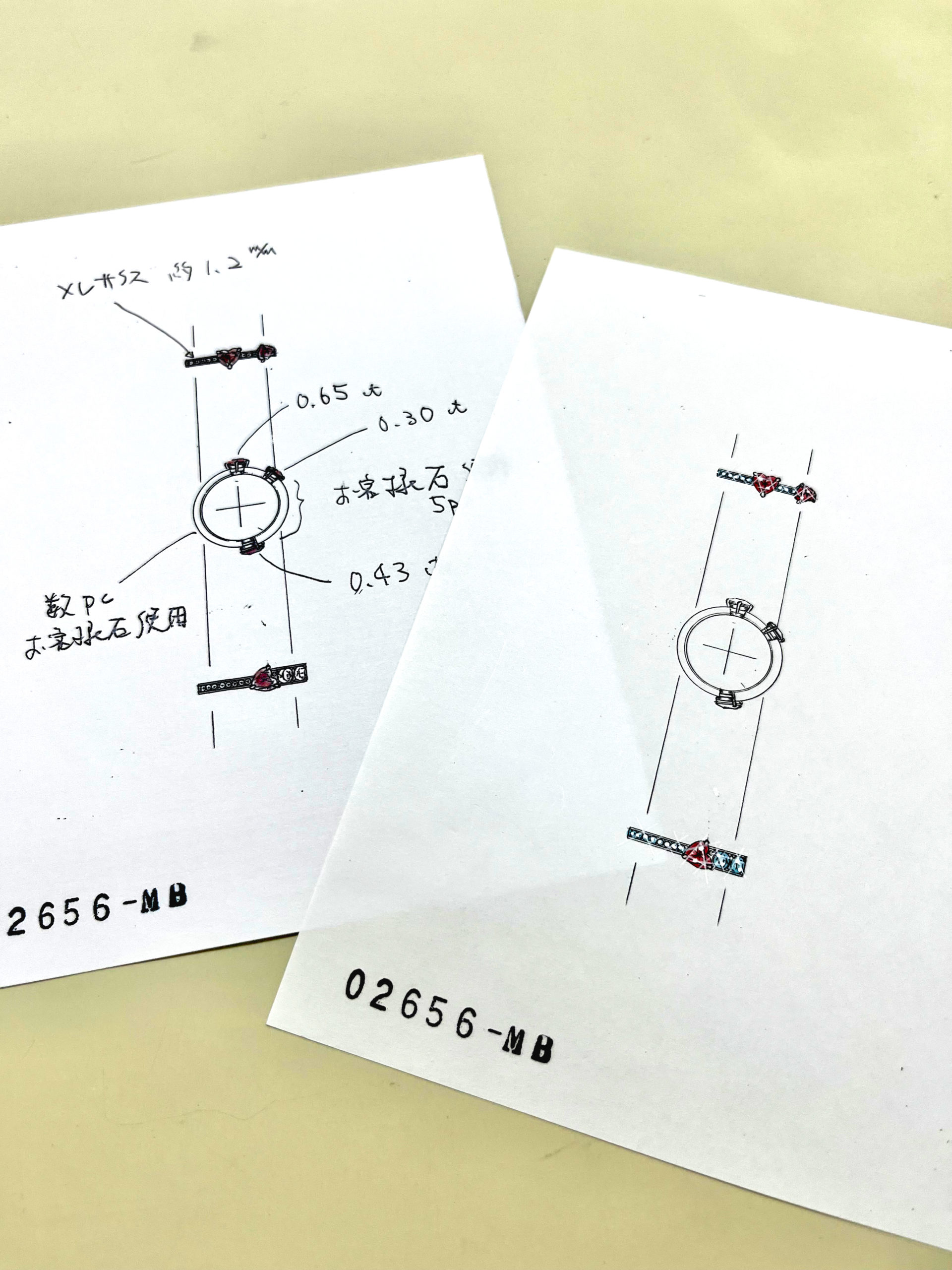 お客様にルビーのセットをお決めいただき、「お持ちのダイヤモンドメレをリングに加えたい」というご要望を加味し何回かのデザイン画のやりとりの後、最終デザインが決定しました。
