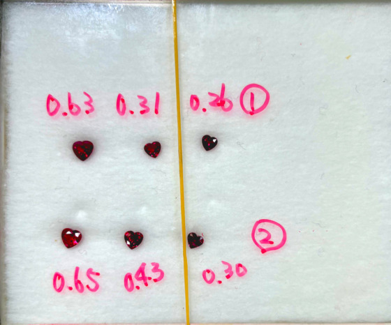 まずルビーさがし。 何種類か色あいのそろったハートシェイプのルビー複数個のセットを時間をかけてさがします。(意外と複数個のルビーの色を合わせるのは大変です。)
