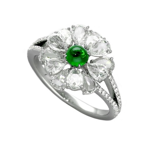 Ring with demantoid garnet surrounded by discreetly sparkling rose-cut diamonds