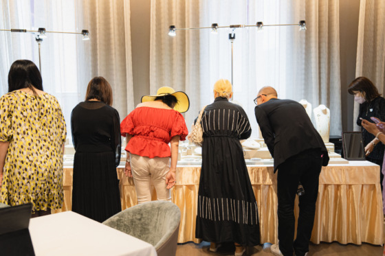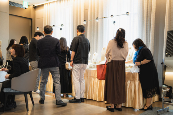 Those who attend the fair include not only those who come to see OKURADO ‘s new jewelry, but also those who come to consult about remodeling their own jewelry, those who come to pick up their custom-made jewelry, and those who come to talk with the artisans about the production process. The fair is a place where we share our values of beauty with customers through various aspects related to jewelry (including the beauty of attire, as the scarf brand VINITIQUE also participated this time).