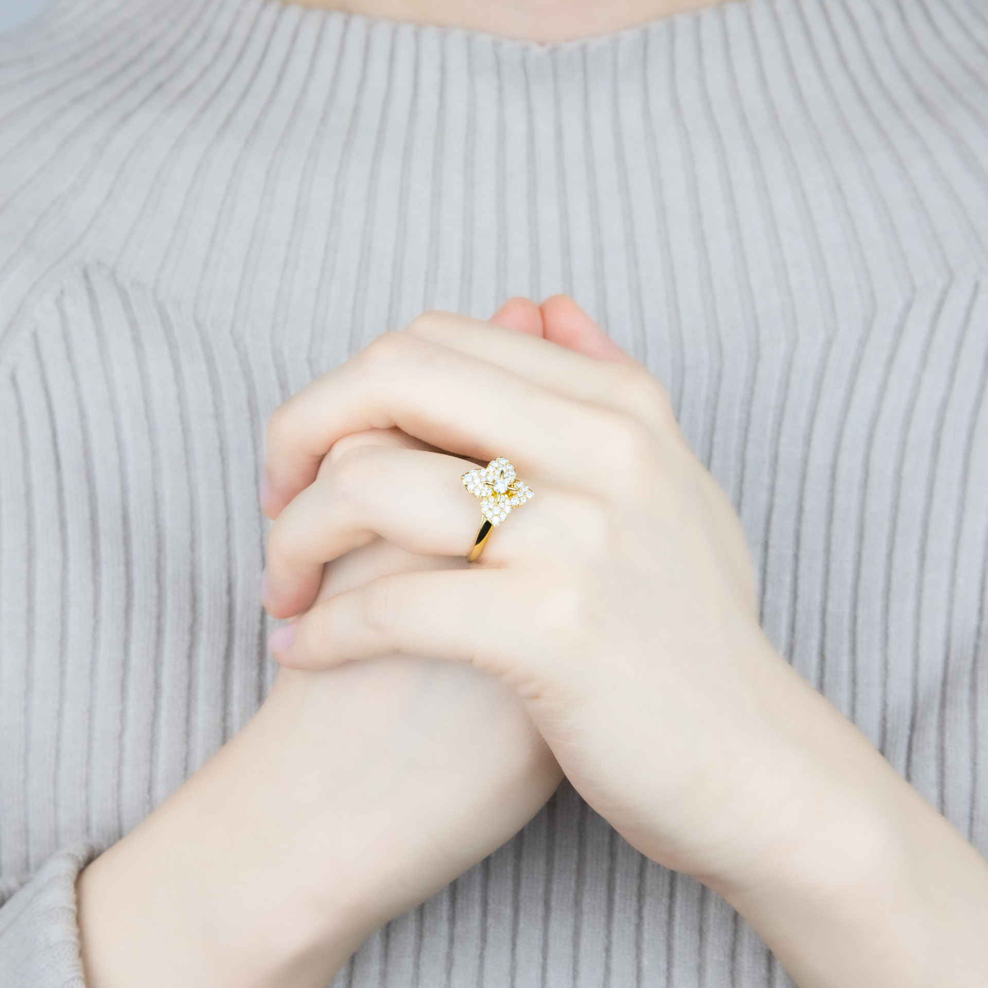 繊細な花弁に隙間なく敷き詰められているのは、OKURADOの厳格な基準を満たしたメレダイヤモンド。F/VS~の厳しい基準を設け、たとえハイグレードのダイヤモンドでも、光りの返りが悪ければ使用せず、4Cの基準では表せない独自の選別を行っています。こうしてセレクトされたダイヤモンドは、一流のクラフトマンによってセッティングされ、指で触れると驚くほど滑らかな仕上がりで、美しさだけでなく使い心地にも配慮した作りになっています。
