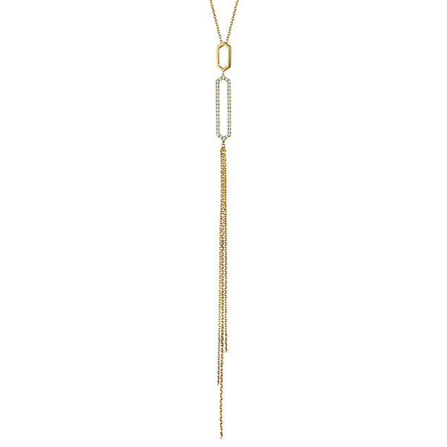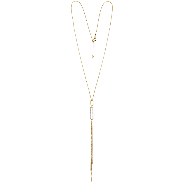 繊細に揺れるチェーンが、胸元に上品な華やかさを添えます。