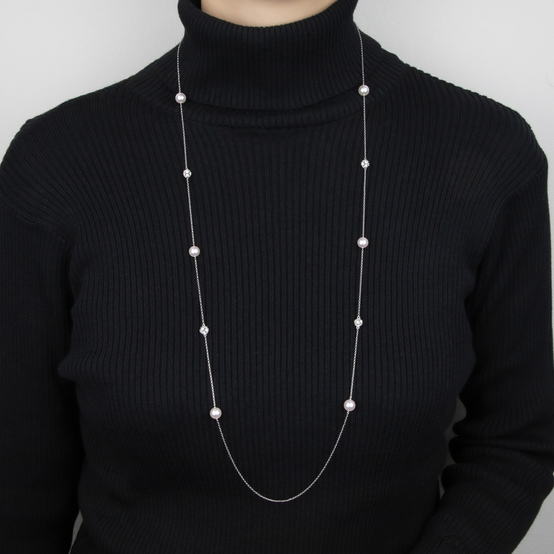 高品質のダイヤモンドとアコヤ真珠が織りなす、柔らかな印象のステーションネックレス。