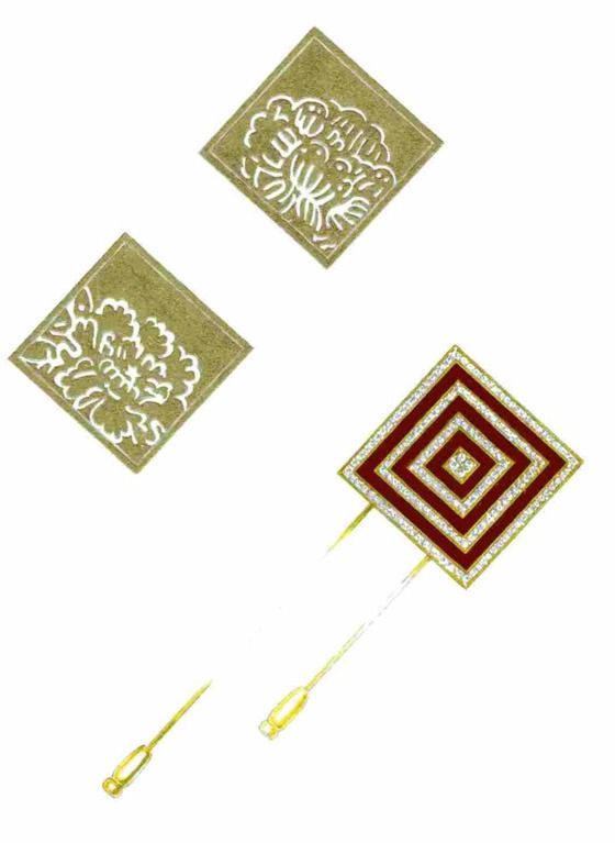 團十郎さんからモナコのアルベール大公へのプレゼントとして、「三升」モチーフのピンブローチの製作が決定しました。素材は18金で、「三升」のように、「團十郎茶」の漆とダイヤモンドを交互に隙間なく三重にセットしていきます。